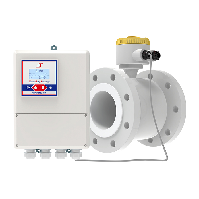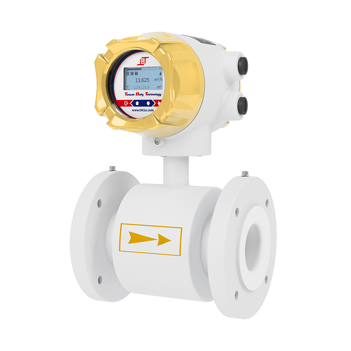 FT041電磁式流量計適用於測量封閉管路中流動的導電性液體的體積流量,具有LCD顯示,mA、Pulse、RS485、HART輸出,可同時顯示瞬間流量、流速以及累積流量。其測量原理是基於【法拉第電磁感應定律】來設計。當測量流量時,流體流過電磁線圈所產生的磁場時,液體的導電性流動感應出一個與平均流速(即體積流量)成正比的電壓,因此要求被測的流動液體具有最低限度的電導率。其感應電壓訊號透過直接接觸流體的正電極與接地電極檢測出流速,再透過電纜線傳送至微電腦傳訊器計算流量顯示在傳訊器的顯示幕上。傳訊器藉由微電腦電路板轉換成數位、類比訊號再傳送至中央系統(DCS、PLC、DDC、PC)中。